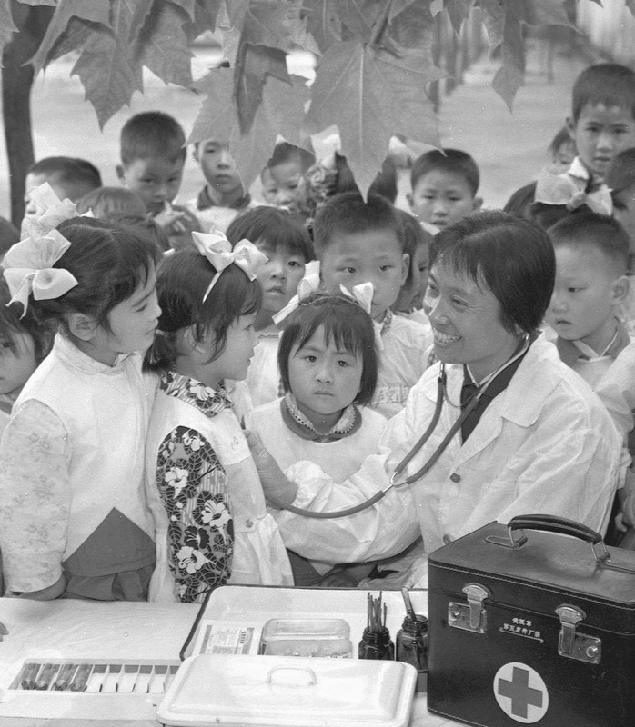 湖北省蘄春縣的「赤腳醫生」在為農村幼兒園的小朋友進行身體檢查。